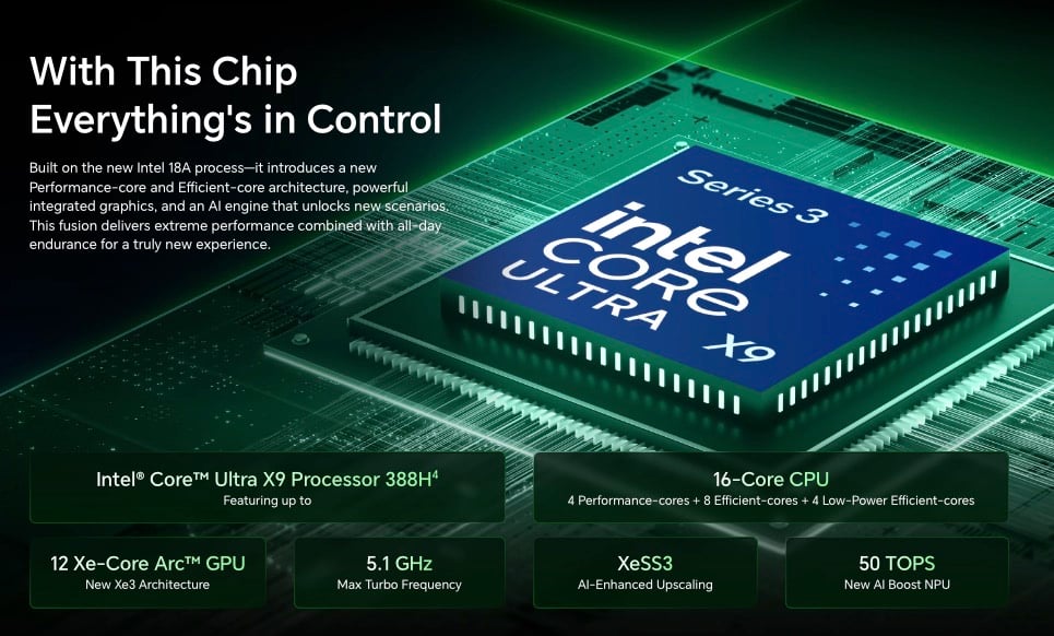 MagicBook Pro 14 2026 緊跟 intel 最新步伐,全系搭載 Panther Lake 架構處理器,提供 Core Ultra 5 336H、338H 以及定位更高的 Ultra X9 388H 三種選擇。與之搭配的是 24GB 或 32GB 的 LPDDR5X RAM,以及雙 M.2 2280 SSD 插槽。標配 1TB SSD 的同時,用戶可以根據需要自行擴容,解決了輕薄本普遍存在的存儲焦慮問題。官方強調,儘管機身輕薄,但整機性能釋放最高可達 80W。